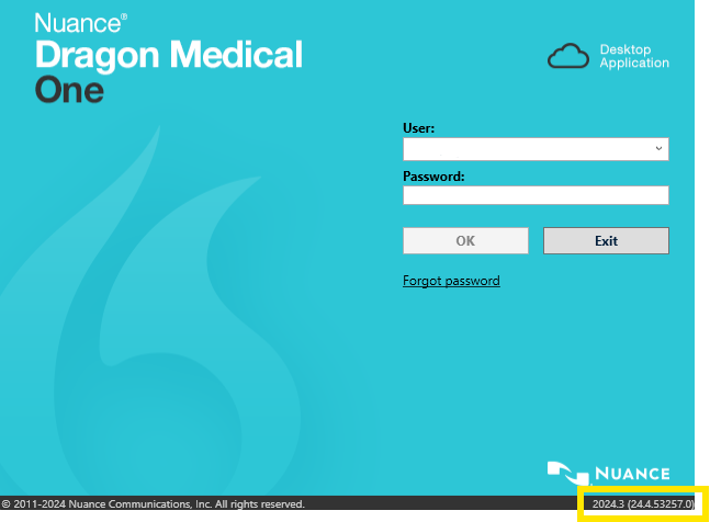 When you open Dragon Medical One, on the login screen your version will be shown in the bottom right-hand corner, highlighted in yellow below.